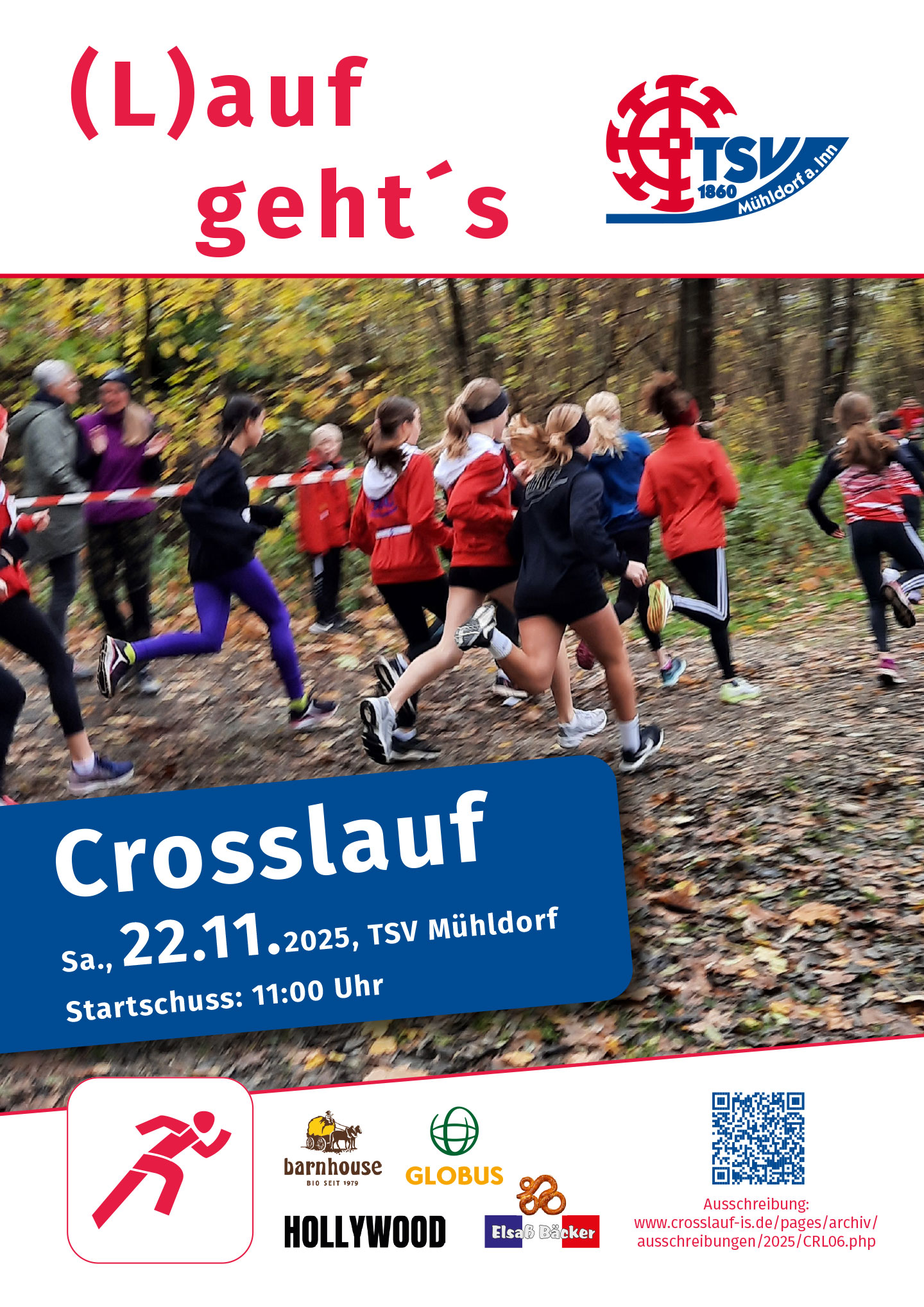 Am Samstag, 22. November 2025, lädt der TSV Mühldorf alle Laufbegeisterten zum diesjährigen Crosslauf ein. Der Startschuss fällt um 11:00 Uhr. Egal ob Hobbyläufer oder Wettkampfsportler – freut euch auf eine abwechslungsreiche Strecke und ein sportliches Gemeinschaftserlebnis. Wir freuen uns auf viele Teilnehmende und Zuschauer!