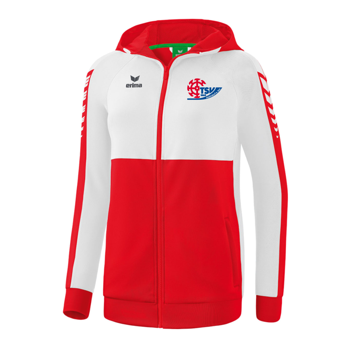 Die Six Wings Trainingsjacke von erima ist aus einem robusten Materialmix gefertigt, der jeder sportlichen Herausforderung standhält. Dank dem Baumwollanteil fühlt sich die Trainingsjacke super weich auf der Haut an. Gleichzeitig erhält sie durch das Polyester ihre funktionellen Eigenschaften. Die Trainingsjacke kommt mit praktischen Extras, wie seitlichen Reißverschlusstaschen, breiten Rippbündchen an den Ärmeln und dem Saum sowie einem hohen Kragen mit Kapuze, welche sie zu einem wahren Must-have machen. So präsentierst Du Dich bestens in den Farben Deines Heimatvereins, dem TSV 1860 Mühldorf.