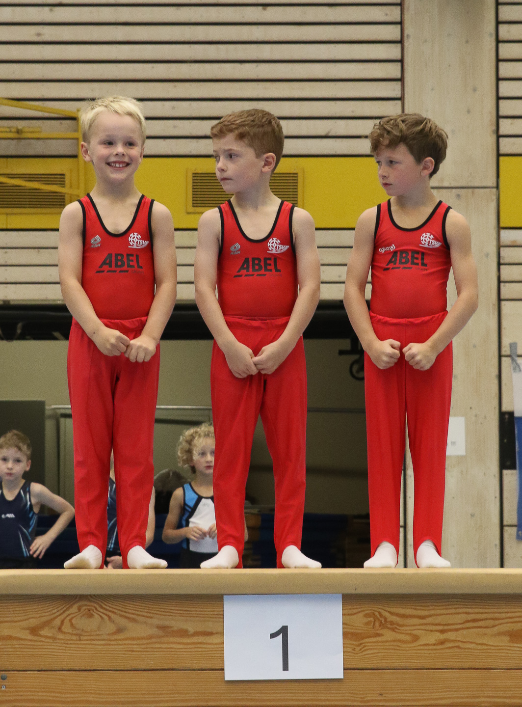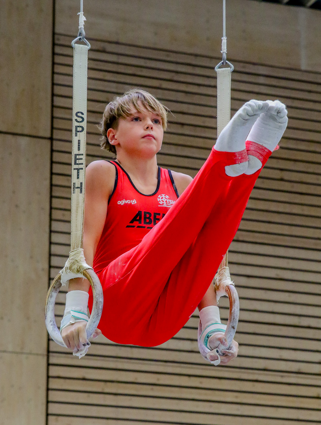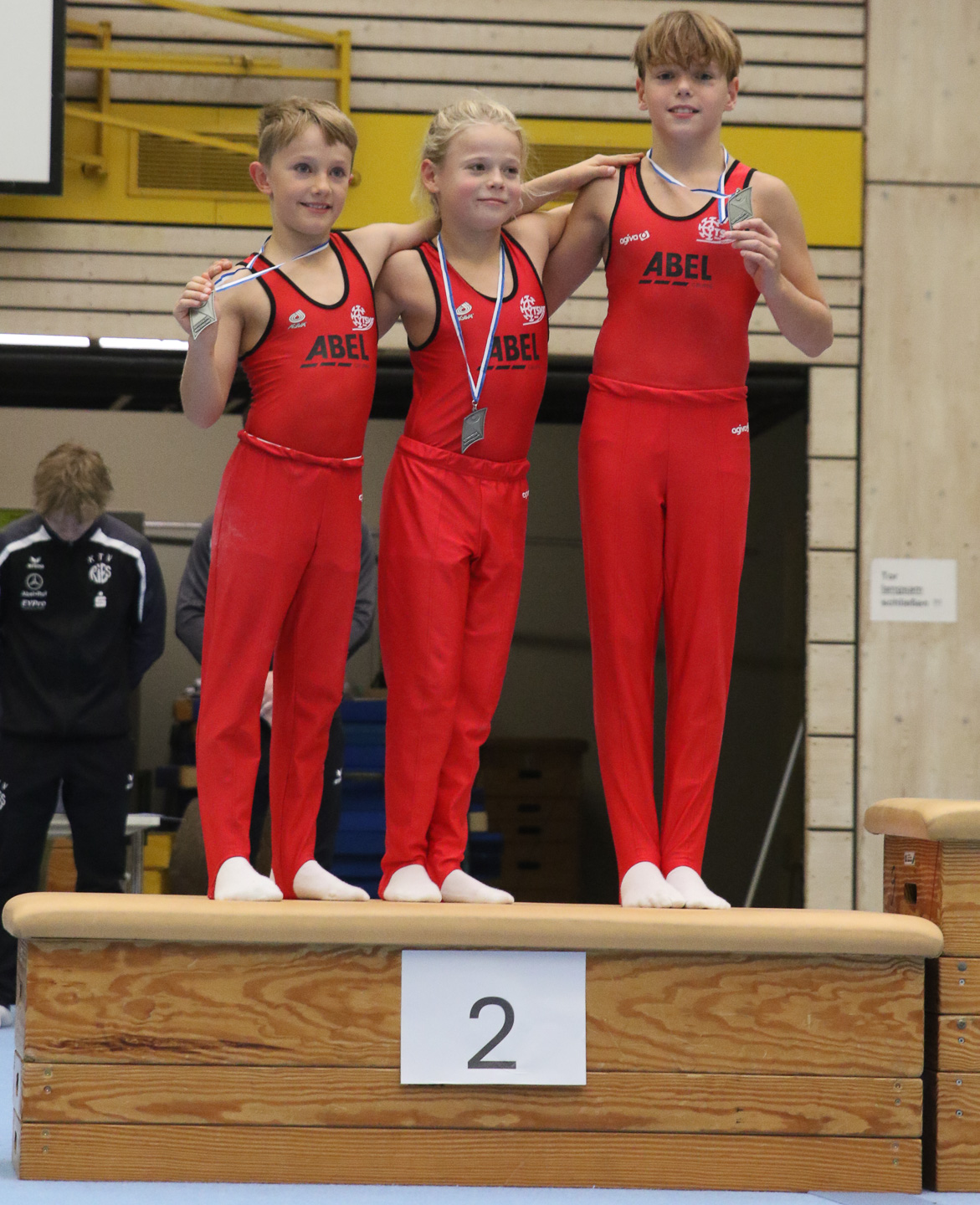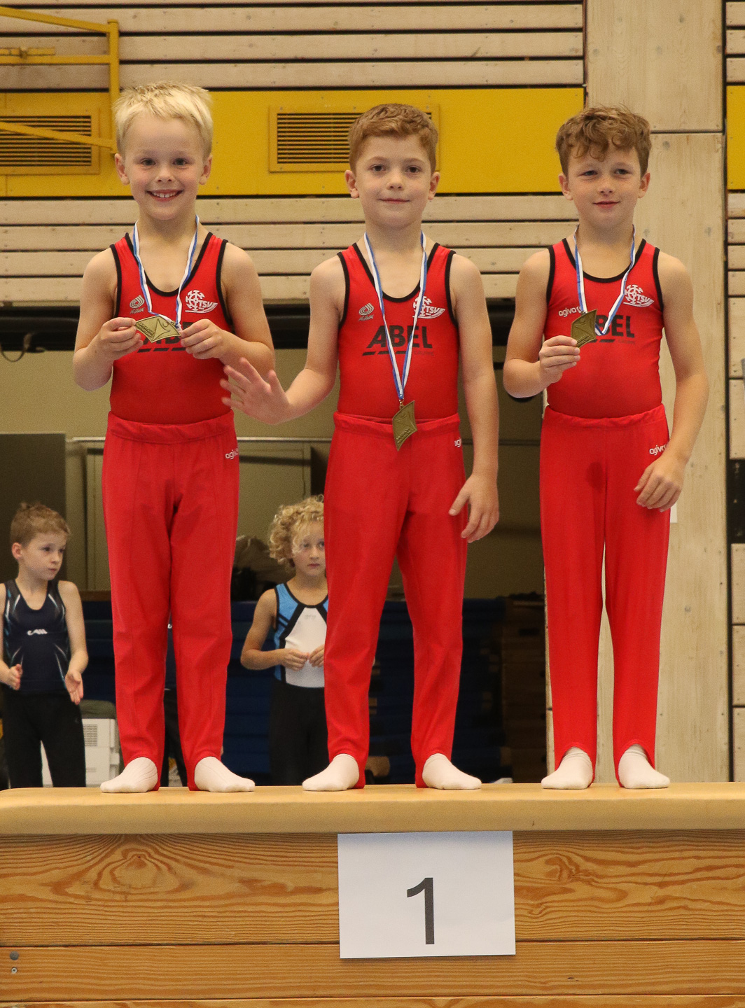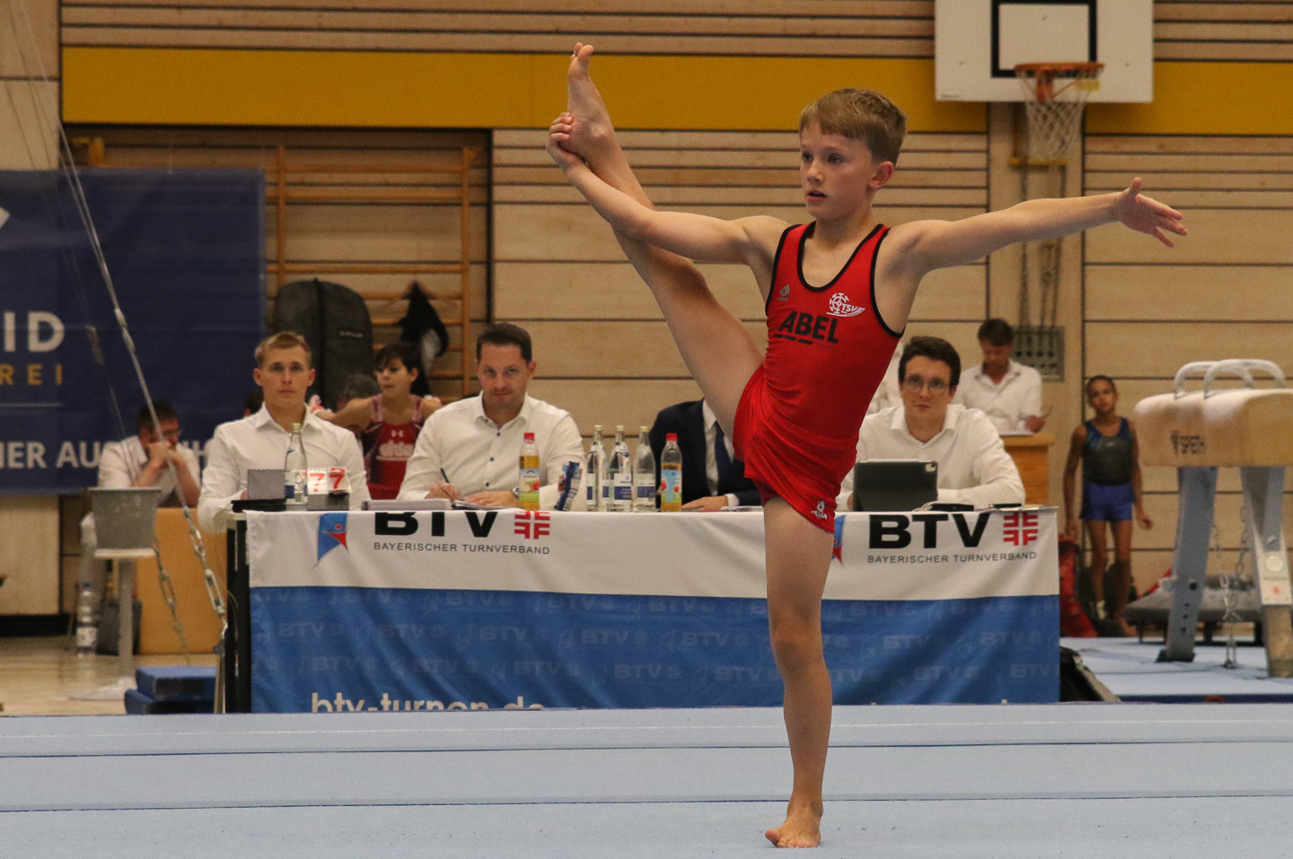 In der Altersklasse 7 stellte der TSV mit Maximilian Baumgartner, Oskar Hell und Moritz Mirz eine besonders leistungsstarke Mannschaft. Da nur drei Turner pro Team antreten durften, startete Jakob Gebhart außer Konkurrenz. Schon am Startgerät, den Ringen, zeigte sich die hohe Leistungsdichte der Mühldorfer, die sich früh mit drei Punkten vom Feld absetzen konnten. Am Sprung überzeugten Moritz (9,60), Oskar (9,65) und Maximilian Baumgartner mit der Tageshöchstwertung von 9,90 Punkten.